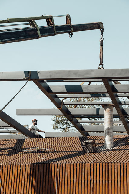 Além disso, o mínimo impacto ao ambiente do entorno não se refere apenas à questão visual ou funcional, mas também à socioambiental, e por isso houve uma preocupação na escolha da construção à seco, ideal para redução do consumo de água e da produção de resíduos e entulhos. Dessa forma, a obra do estúdio foi realizada em 7 meses, com a cafeteria em funcionamento durante todo o processo, exceto no dia em que foi realizada a colocação dos pilares. A conclusão foi um esforço conjunto de agentes locais, contribuindo com o mercado da construção civil municipal, e contou majoritariamente com mão de obra e matéria prima locais.